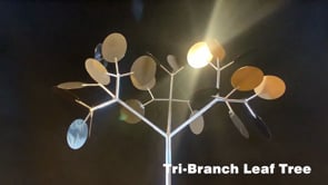 This newest Leaf Tree again takes the original concept and completely reworks the design and construction. The previous designs (which I’m sure I will return to soon) are based on a cross bar on which other “branches” are mounted and ultimately the leaves. In the Tri-Branch starts with a center mounting column with three upward branches rather than two straight across, an upside down tripod. On each of those three tripod branches are mounted three more, and then three more again each to produce a structure supporting 27 leaves, rather than sequentially larger 16, 32 and 64 of the previous. And for the first time the leaves are rendered in Stainless Steel rather than aluminum for ultimate reflectivity.